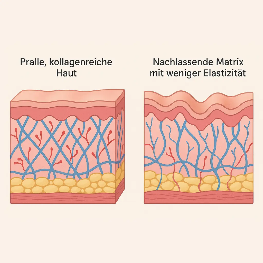 Die obige Abbildung würde links eine pralle, kollagenreiche Haut zeigen – und rechts eine nachlassende Matrix mit weniger Elastizität.