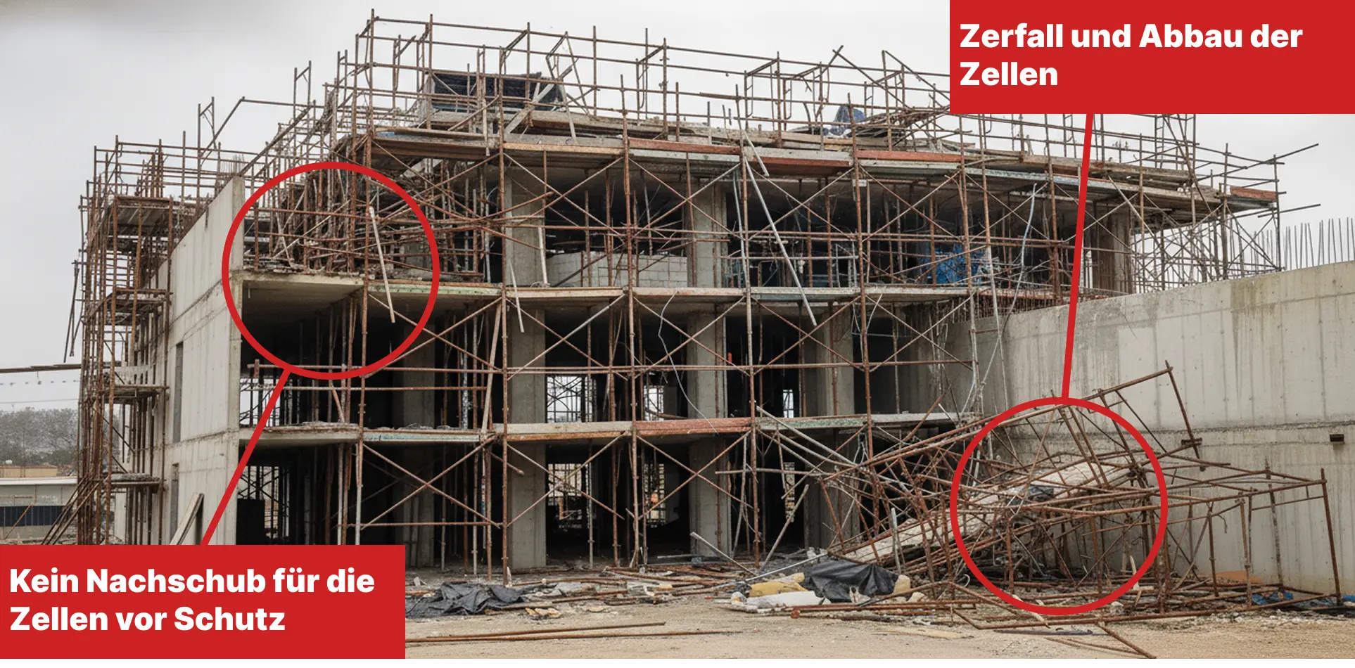 Wenn du den Zellen keinen Nachschub gibst und sie nicht vor weiteren Schäden schützt, schreitet der Abbau fort – ganz wie ein Gerüst, das ohne Material und Versiegelung langsam zerfällt.