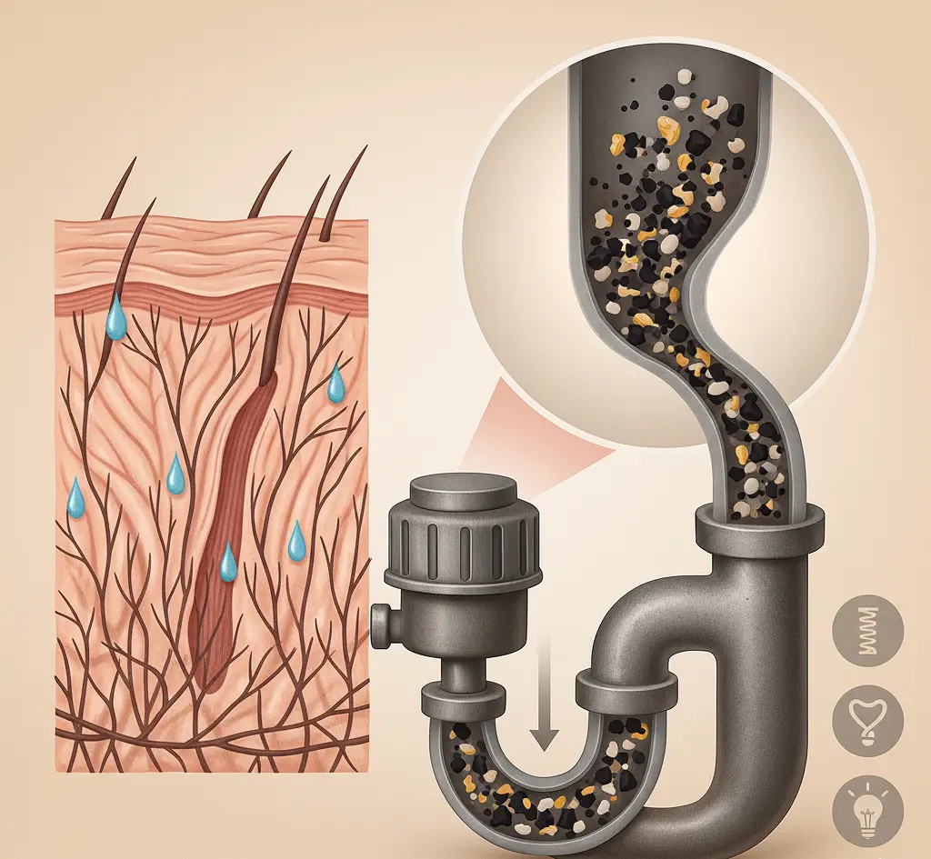 Und genau wie bei einem verstopften Abfluss, in dem nichts mehr richtig zirkuliert, fehlt der Haut der „freie Fluss“ von Aufbaustoffen und Schutz: Zellen kommen unter oxidativen Druck, Reparaturprozesse verlangsamen sich – Spannkraft und Glow nehmen spürbar ab.