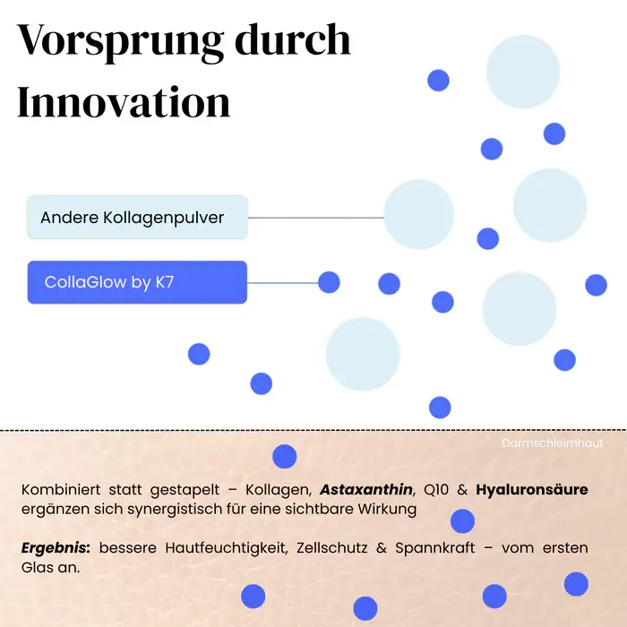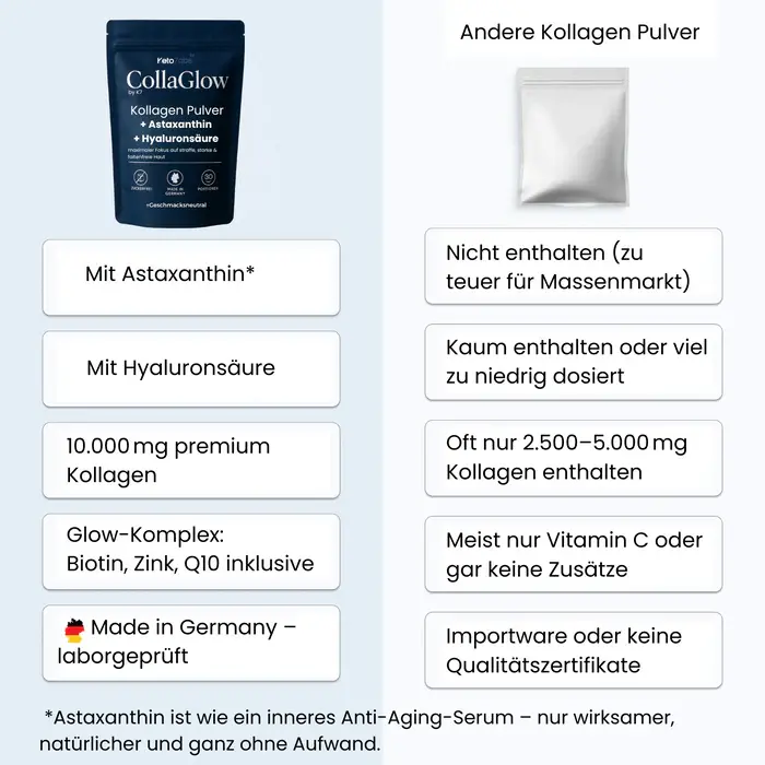 CollaGlow® kombiniert 10.000 mg Kollagen mit Hyaluronsäure und Astaxanthin – dem „rote-Alge-Powerstoff“ – für Aufbau + Schutz in einem Schritt.
