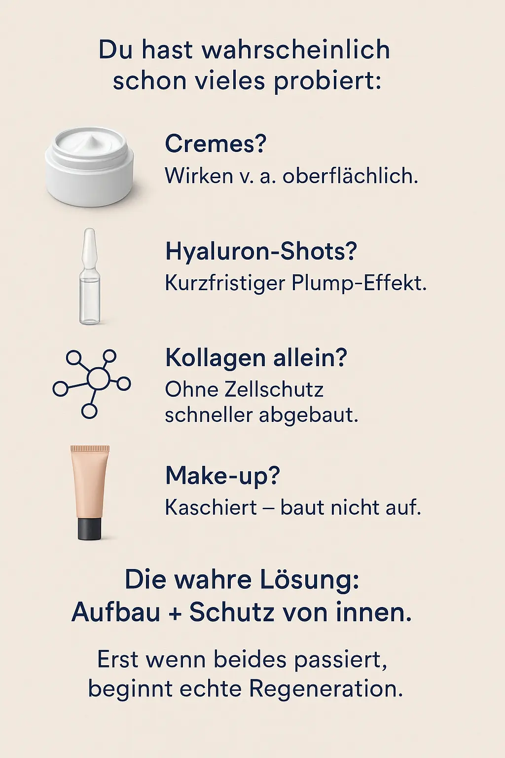 Die Antwort liegt nicht in immer neuen Schichten Make-up – sondern in Aufbau + Schutz von innen.